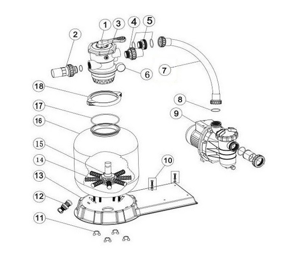 Корпус бочки фильтра изготовлен из стекловолокна, а насосная часть изготовлена из термостойкого пластика, не подвергается воздействию влаги, ультрафиолетовых лучей и других неблагоприятных факторов. Фильтр оснащён 6-позиционным клапаном. Все элементы смонтированы на общей платформе для удобства установки и эксплуатации. Для контроля давления системы предусмотрен манометр.