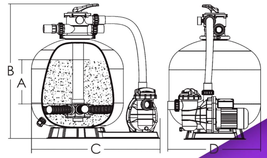 | Артикул | Модель | Фильтр | Насос | Соединение | Песок, кг | А, мм | В, мм | С, мм | D, мм | Производительность, м3/час |