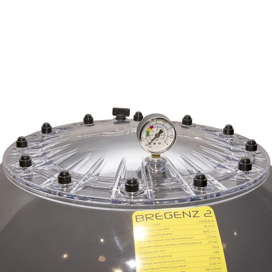 Специальная конструкция серии песочных фильтров Bregenz II значительно упрощает осмотр и техническое обслуживание песочного фильтра. Корпус фильтра изготовлен из полиэстера и устойчивого к ультрафиолетовому излучению гелевого покрытия.