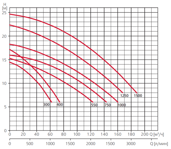 | Модель | Напор, м | 22 | 21 | 20 | 19 | 18 | 17 | 16 | 15 | 14 | 13 | 12 | 11 | 10 | 9 | 8 | 7 | 6 |