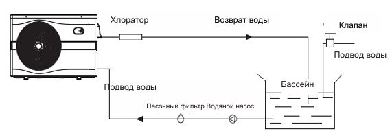 *Схема представлена только для ознакомительных целей. При монтаже водопровода смотреть табличку с указанием подвода/отвода (IN/OUT) воды на тепловом насосе.