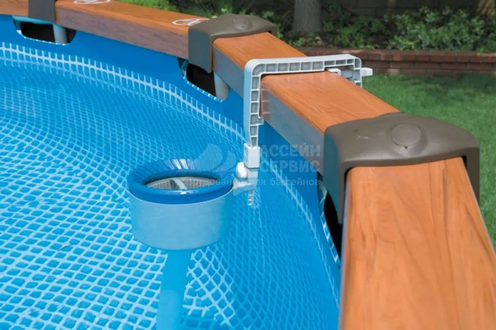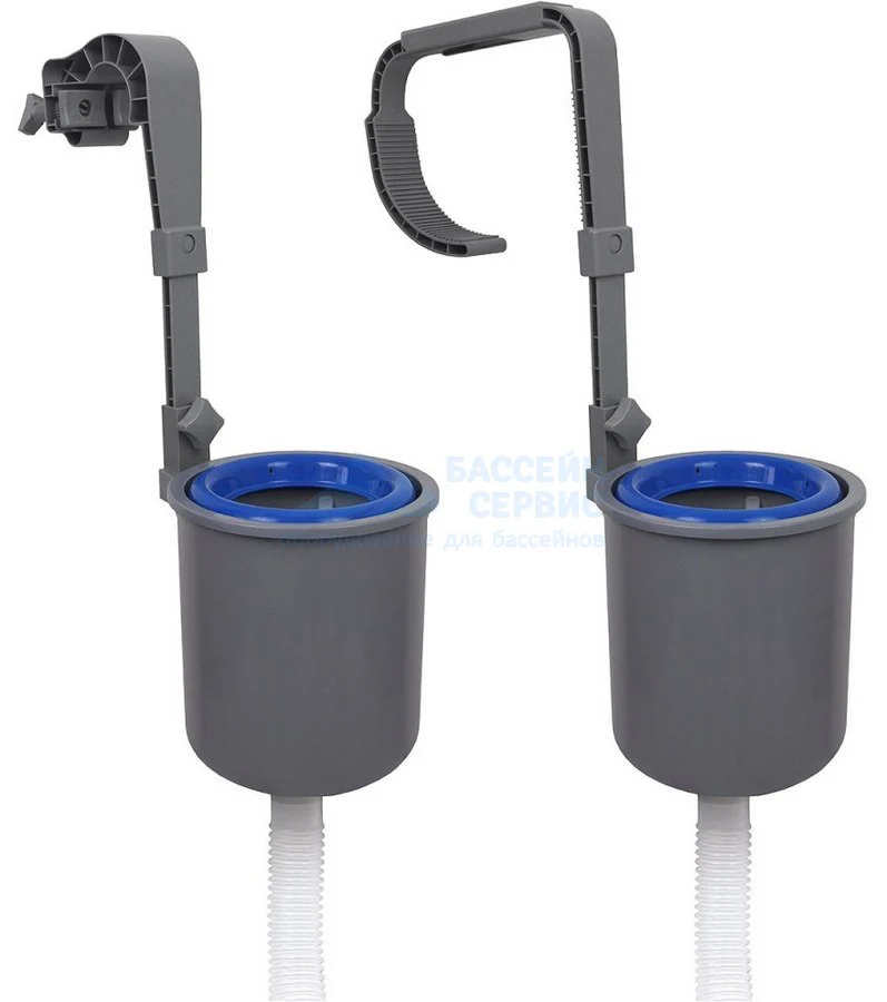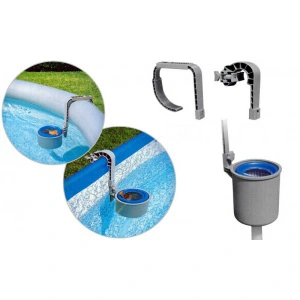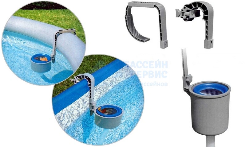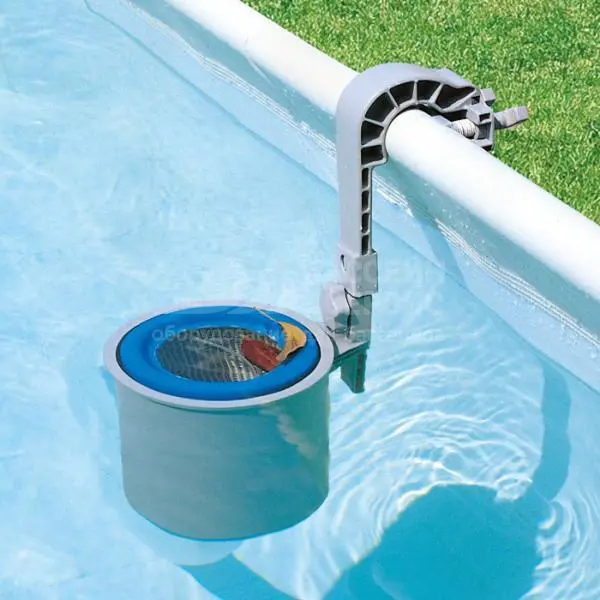 Скиммер легко крепится на бортике как каркасных, так и надувных бассейнов одним из двух регулируемых кроштейнов. Если скиммер засорился, достаточно снять корзину, очистить её от мусора — и устройство снова готово к работе.